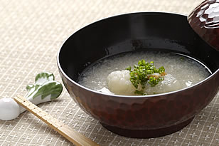 【材 料】 カブ…100g、レンコン…100g、だし汁…300ml、薄口しょうゆ…小さじ2、焼きちくわ…20g、ネギ…少々 【作り方】 1.カブは適当な大きさに切り、柔らかくゆでる 2.ちくわは輪切りにし、レンコンはすりおろす 3.だし汁に薄口しょうゆで味をつけ、鍋にカブを加え、沸騰してきたら2.を加えひと煮たちさせる。 最後にネギを散らす |