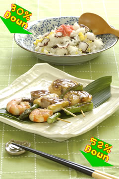 | シーフード串焼き3種 通常253kcal→122kcal | |