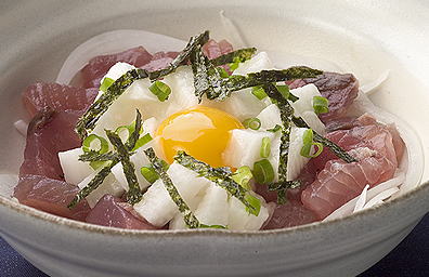 器に新タマネギ、カツオ、長芋の順に重ねて盛り付け、小ネギ、焼きのりを散らし、好みでうずら卵を載せる。Aのたれをかけ、全体をよく混ぜていただく |